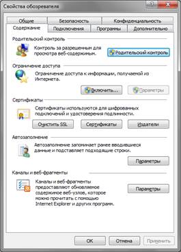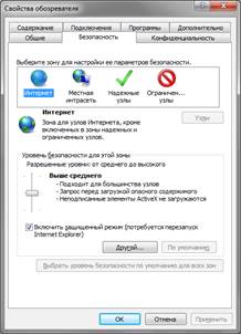 Используя вкладку «Безопасность» (Рисунок 1.11) диалогового окна «Свойства обозревателя», можно установить для зон Интернета разные параметры безопасности. В верхней части вкладки расположен представленный в виде значков список основных категорий зон, на которые имеется доступ с компьютера пользователя (Таблица 1.2).