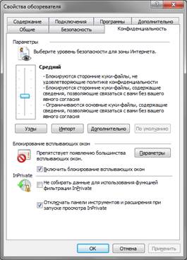 Вкладка «Конфиденциальность» содержит ползунок настройки безопасности в зонах Интернета, а так же настройка поведения «кукесов» для определенных сайтов и их автоматическую обработку (Рисунок 1.12).